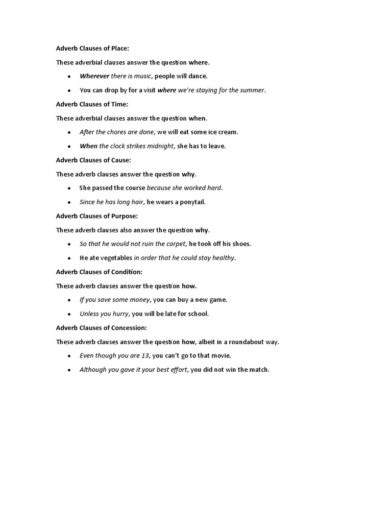 As soon as the wife saw her. This type of clause usually employs. Adverbial clauses generally follow the main clause unless otherwise stated. Adverbial clauses sentences with examples in. Sets where the action of the main clause takes place. As with all clauses, it contains a subject and predicate, though the subject as well as the (predicate) verb may sometimes be omitted and implied. An adverbial clause is a group of words that plays the role of an adverb. An adverbial clause of place describes where something has occurred or will occur. I will follow you wherever you go. He made an impact everywhere that he went. An adverbial place clause tells where the action described by the main verb takes place. Unlike adverbs, adverbial clauses modify whole clauses rather than just a verb. There are many different types:
